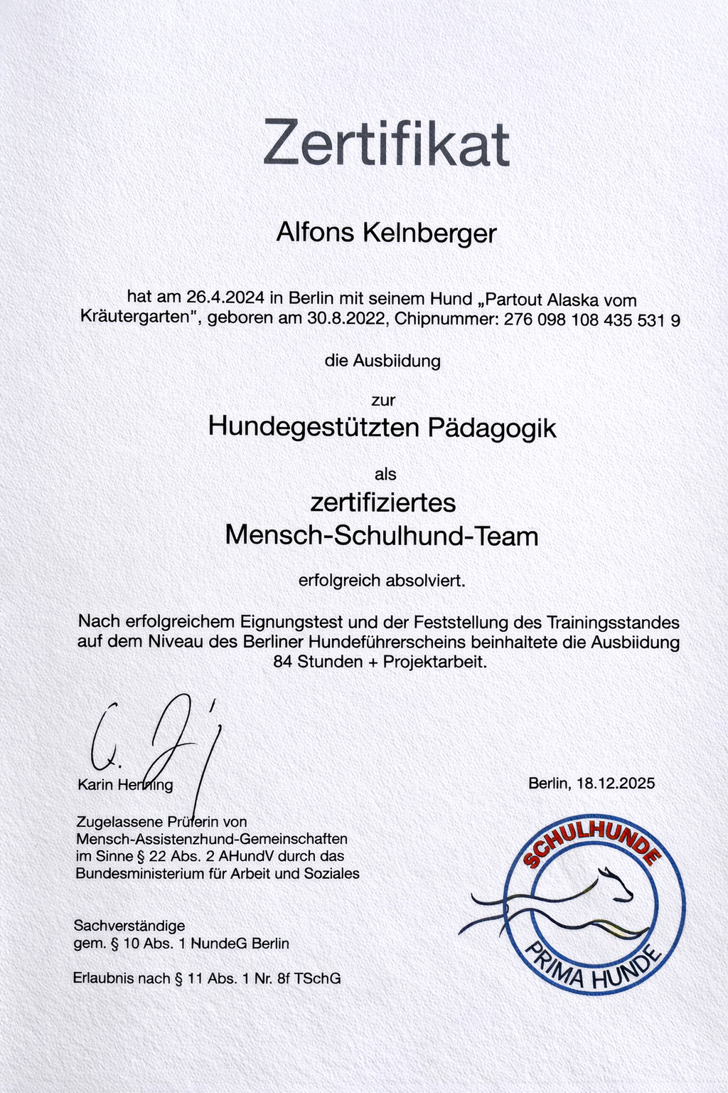 Unser Kollege Herr Kelnberger bildet jetzt zusammen mit seinem Hund Alaska ein pädagogisches Team! Wir gratulieren zu dieser Auszeichnung und freuen uns über die Teilnahme des Hundes am Schulleben!